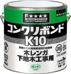 ボンドK10は、コンクリート、木材、スレート等に優れた接着性を示し、主としてコンクリートと木レンガ・壁天井用ボード類との接着を目的とした各種内装施工用接着剤です。