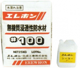 エレホン#100無機質浸透性防水材は、コンクリート中に存在する遊離石灰を求めて浸透し不溶性の結晶体と成り深さ20mm~30mmの不透水性防水層をコンクリート躯体中に形成する。従って表面的な塗膜防水材とは異なり、躯体その物を防水体に変化させるセメント系防水材であります。